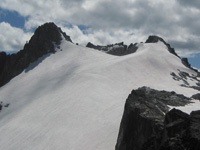 The summit is reached by ascending the short but steeper snow and ice couloir (40 degrees) on the north face. Depending on snow coverage and season, crampons may be required for this final section. Please note that there are a few crevasses on the north glacier, roped glacier travel is advised. This route is the best possible descent from Gray’s peak.