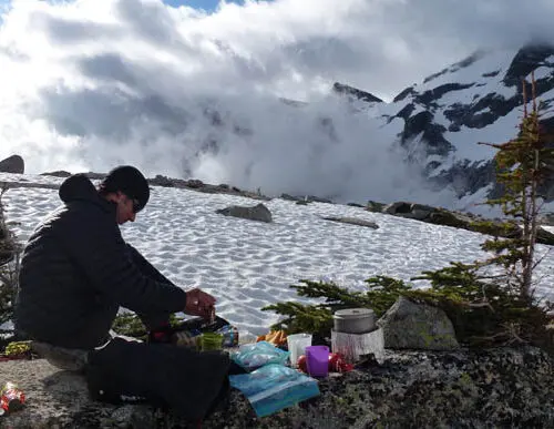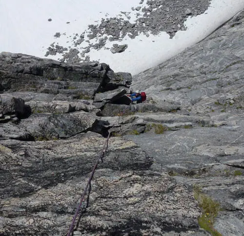 To get into Mulvey Basin from the col, start by locating an exposed but very handy left trending diagonal ledge on the steep north side of the col which begins near the middle of the broad col (cairn). Carefully scramble down the initial moves then traverse more easily West to the top of a steep snow/ice slope. Descend this slope; depending on the conditions crampons and ice axe can be very useful. Continue descending into Mulvey basin on snow (early season) or rock slabs (late season). Many beautiful alpine meadow for camping with good water options exist near the upper Mulvey Lakes (300m elevation loss over 1km). To access the South Face from Mulvey Lakes, ascend moderately steep slopes up and left of some rock slabs in a Westerly direction and eventually gentle slopes in a Northwesterly direction (300m elevation gain over 1.5 km).