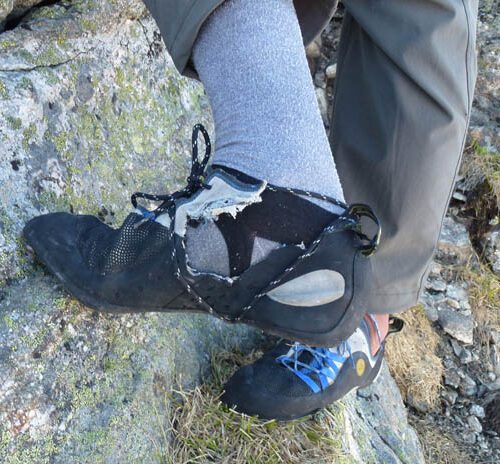 P6. Climb up and left via a thin lay-back seam past 2 bolts. Continue up and right over a steep flake passing one fix piton. Beware of a precarious looking flake above the piton, it is avoidable. Continue up