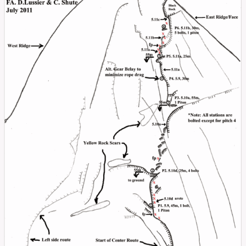 The route starts about 15m right of the 1st pitch on the original “Center Route”. It begins near the base of a left slanting crack/ramp about two thirds of the way right across the South Face.
