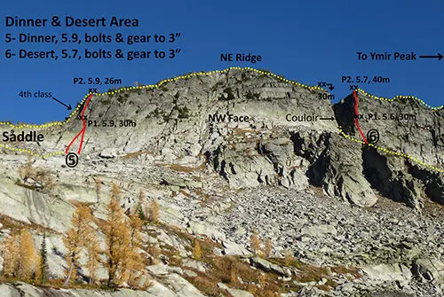 To get to “Dessert,” scramble along the increasingly exposed & beautiful NE Ridge of Ymir Peak for 120m to a 2 bolt anchor near a sharp notch and steep west-facing couloir. Make a wild 30m rappel in the couloir beside a cool rock feature dubbed the “Fingerboard.” Scramble down another 30m to the bottom of the loose couloir (or 35-40-deg snow). “Dessert” climbs the arête-like feature on the climber’s right side of the couloir back up to the NE Ridge of Ymir Peak.