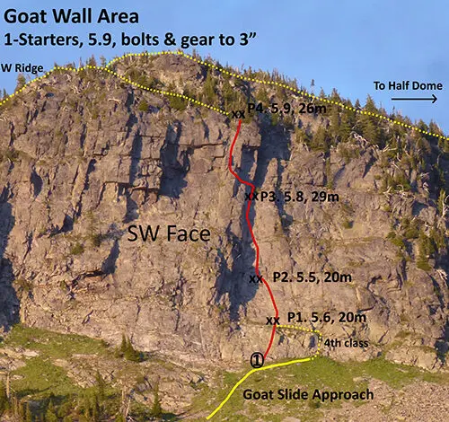 P4. 29m, 5.9, 5 bolts & gear. Continue up the corner above to the first bolt. Step left (5.9) and make a rising traverse towards a second bolt. Climb up and left past a third bolt then ascend a broken groove straight up followed by a thin finger crack. A final bolt-protected slab move (5.9) leads to a two bolt anchor at the top of the Goat Wall.