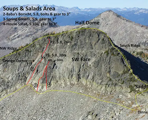 The names used for the various climbs were inspired by the famous Whitewater Cookbooks written by Shelly Addams. An ascent of all sections from left to right (including the Salad climbs) combined with ascents of Half Dome & Ymir Peak makes for a fun full day in the hills (referred to as “The Full Meal Deal”). Enjoy and remember to eat your greens: your mom would be proud!