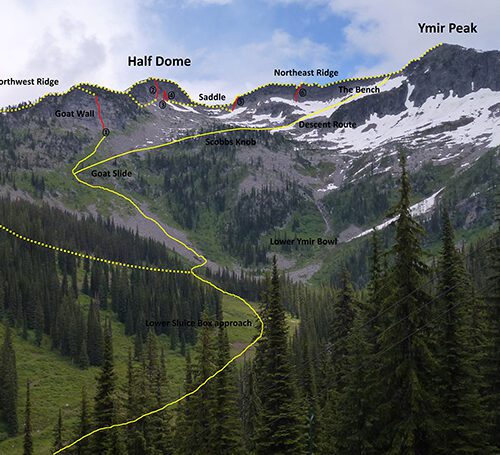 Start by hiking up along the “Lower Sluice Box” ski run towards Ymir Bowl on an old quad trail with a foot path. Some of this section is seasonally wet. After 20 minutes of walking the “trail” merges with a maintenance road. Follow this road up a short distance to a switchback located at the end of the “Little Mucker Traverse.” From here, continue along a faint climber’s trail leading out of the ski area in a south-easterly direction towards Ymir Bowl. This short “trail” initially crosses a healthy section of alder trees before emerging into an open talus slope at the bottom of “Goat Slide” in lower Ymir Bowl. Ascend the steepening talus slope straight up Goat Slide. The talus leads to steep grassy slopes and eventually the base of “Starters” on the Goat Wall. The approach to this point typically takes 1-1.5 hours.