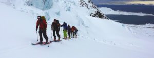 Ski mountaineering is the merging of backcountry ski touring and the sport of mountaineering. It combines all the joy and hardship of earning your turns along with the rewards of basic mountaineering peak ascents. A typical ski mountaineering objective primarily involves a long ski ascent and descent on high alpine and glaciated terrain. Where it becomes mountaineering is that to reach the summit proper, one has to climb on foot over basic rock and/or ice on an exposed summit ridge or mountain face. Ski mountaineering is most rewarding to the skier who likes the added challenge of reaching a significant summit while ski touring.